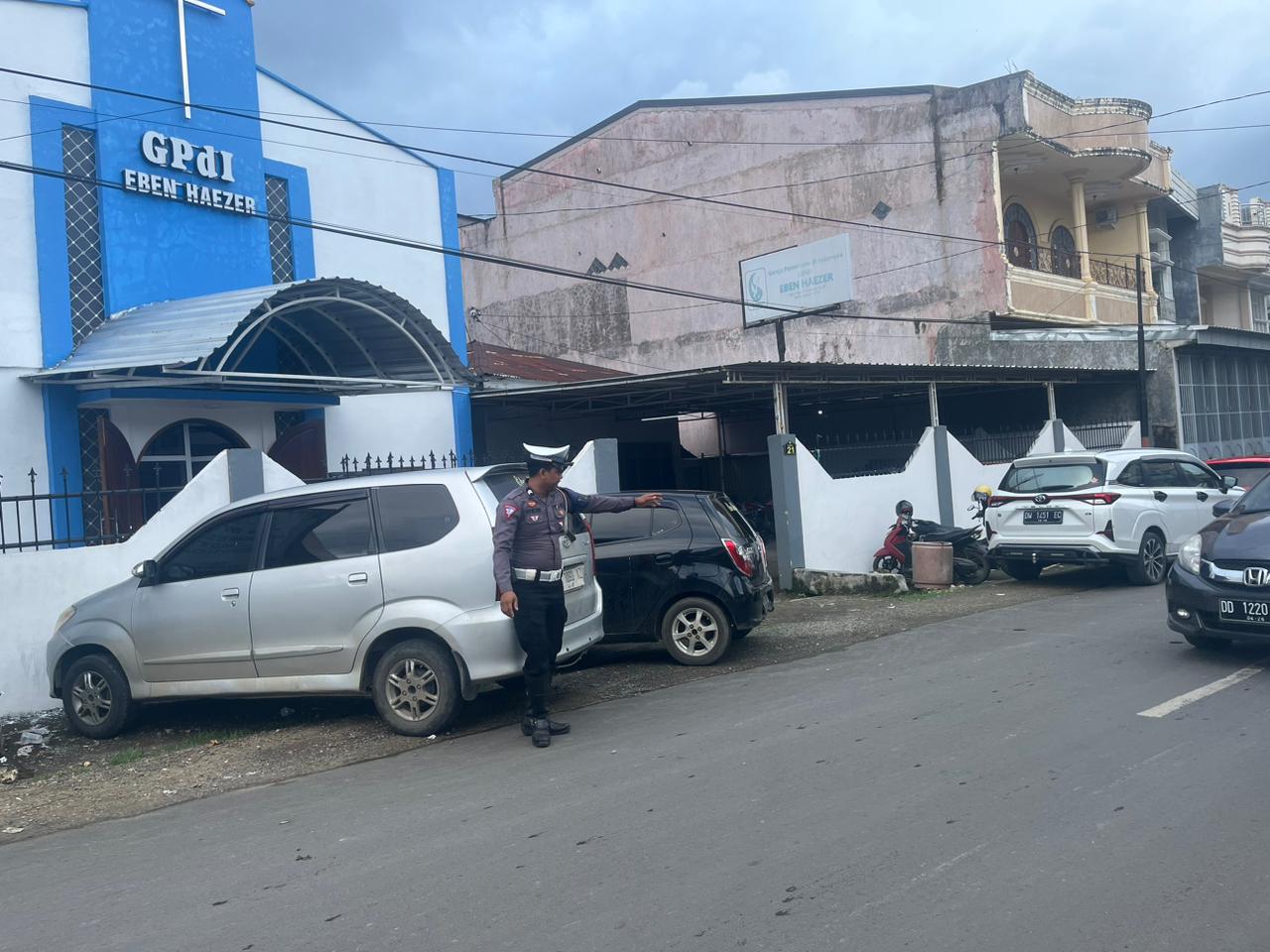 BONE – Personel Satlantas Polres Bone melakukan Pengamanan di Gereja Eben Haezer Sit yang berada di jalan Husain Jeddawi, Macege, Kabupaten Bone, Minggu pagi (9/6/2024).