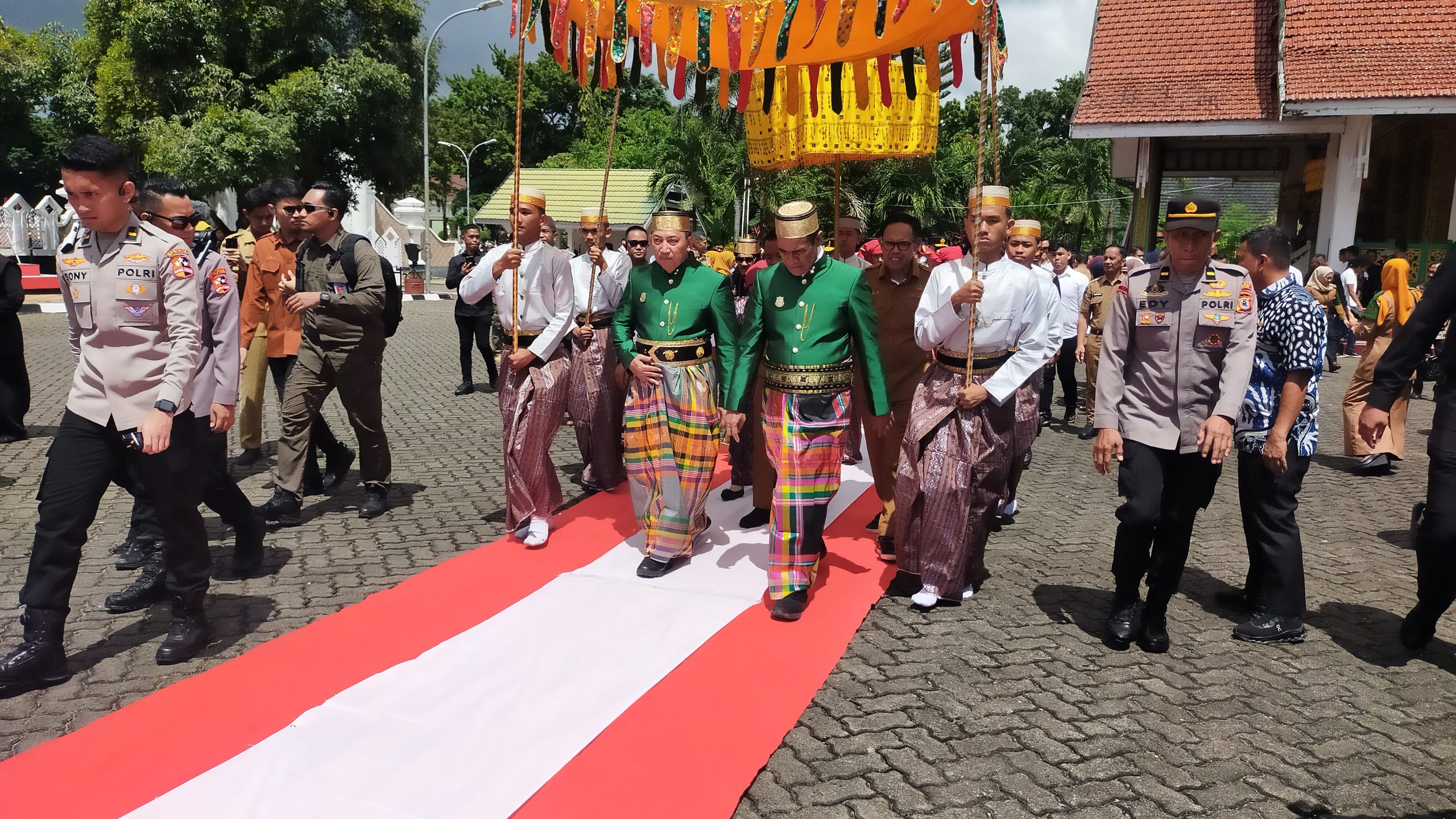 Dari hasil pantauan saat tiba di Rumah Jabatan Bupati Bone, Kedua pejabat Negara itu disambut secara adat seperti prosesi teddung pulaweng, pengalungan sarung khas Bone dan Tarian Pa’duppa.