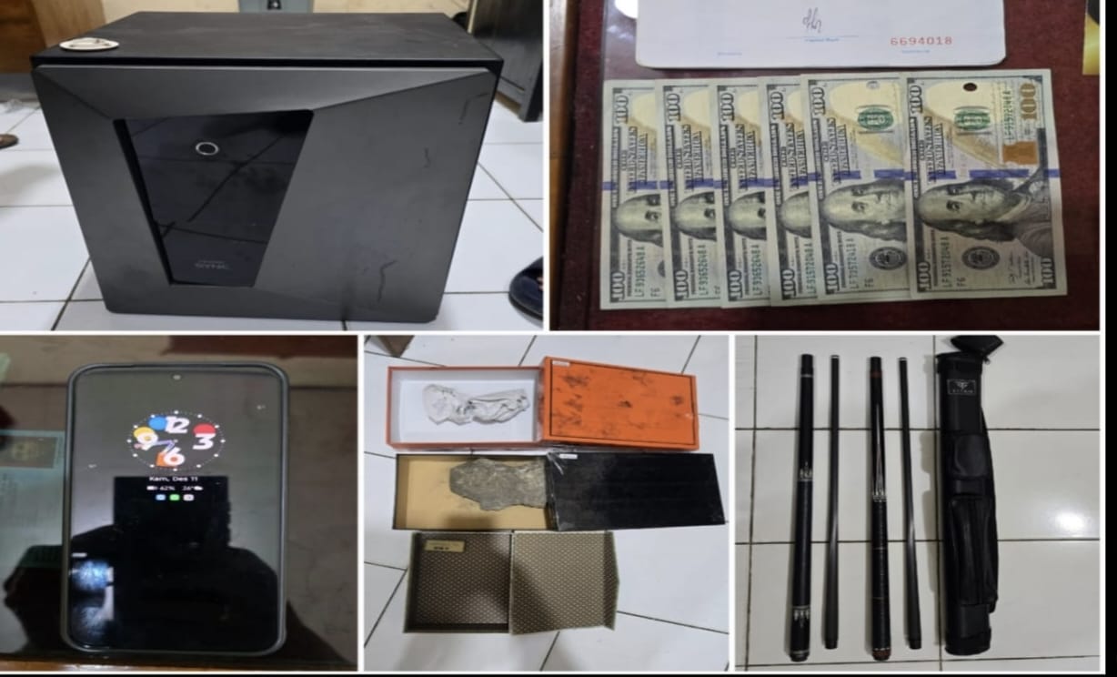 Di antaranya satu buah brankas, satu buku rekening BCA, satu unit handphone, dua buah stik biliar, tiga buah kotak, dan enam lembar uang dolar Amerika pecahan 100 dolar.