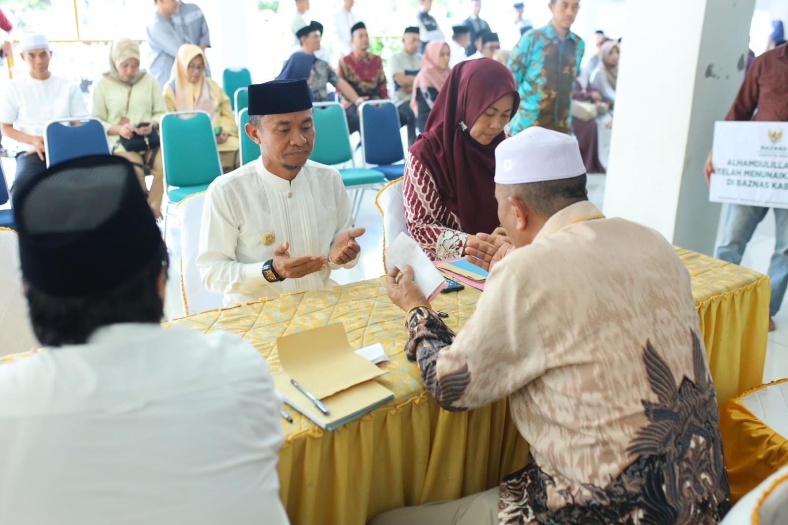 BONE — Bupati Bone H. Andi Asman Sulaiman, S.Sos., M.M., bersama Wakil Bupati Bone Dr. H. Andi Akmal Pasluddin., S.P., M.M., menunaikan zakat bersama para pimpinan Organisasi Perangkat Daerah (OPD) dan camat se-Kabupaten Bone di Kantor Badan Amil Zakat Nasional (BAZNAS) Kabupaten Bone, Kompleks Masjid Agung Al‑Ma’arif, Jumat (6/3/2025).