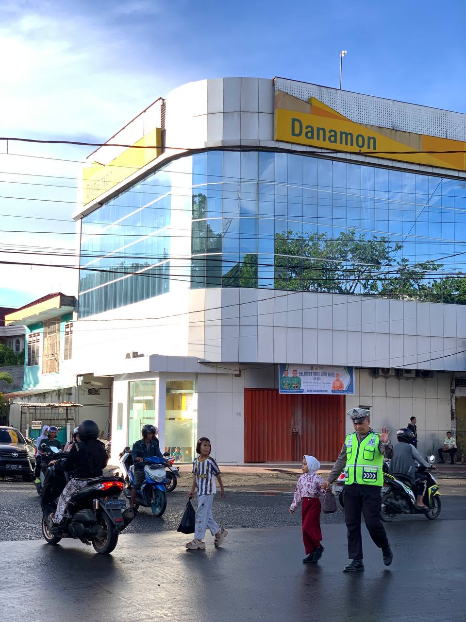 Personel Satlantas tampak aktif melakukan pengaturan arus lalu lintas serta membantu kelancaran aktivitas masyarakat di pagi hari, terutama saat jam sibuk ketika warga memulai rutinitas kerja dan anak-anak berangkat ke sekolah.