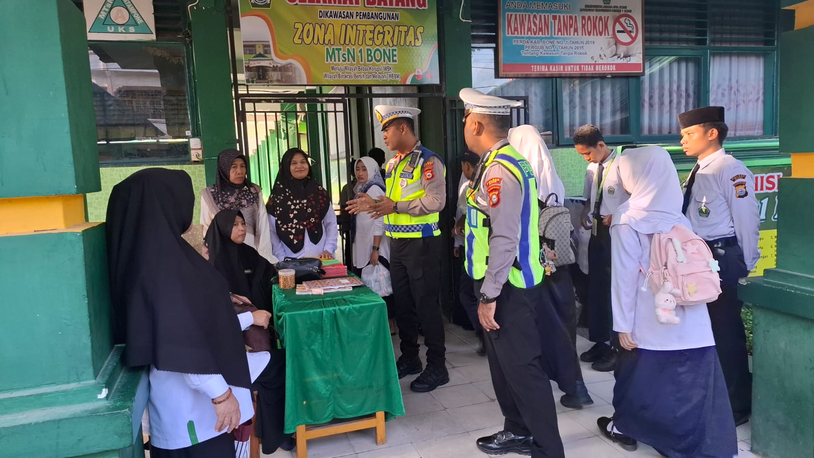 Personel Unit Kamsel melaksanakan kegiatan imbauan keselamatan berlalu lintas kepada orang tua siswa yang mengantar anaknya ke sekolah serta kepada para guru di MTs Negeri 1 Bone.
