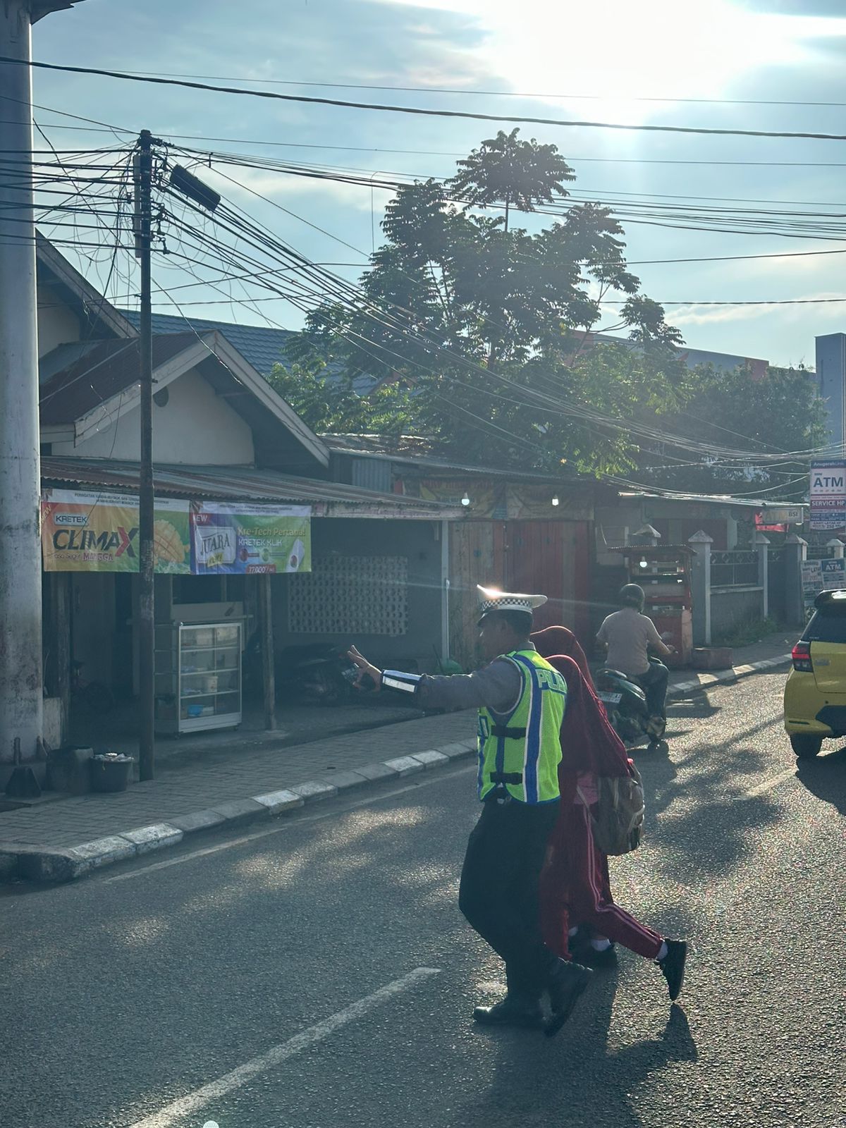 Petugas terlihat sigap membantu penyeberangan pelajar, mengurai arus kendaraan, serta memberikan imbauan kepada pengendara agar selalu tertib dan mematuhi peraturan lalu lintas.