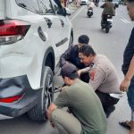 BONE – Anggota Satuan Lalu Lintas (Satlantas) Polres Bone Aipda Ilham membantu pengendara untuk menggantikan ban yang mengalami kebocoran pada mobilnya saat